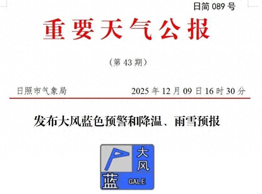 大风:日照市气象台2025年12月09日16时30分发布大风蓝色预警:预计11日白天至12日上午、13日白天至14日中午最大风力内陆4~5级、阵风7级,沿海及近海海域5级、阵风7~8级,海上7级、阵风8~9级。